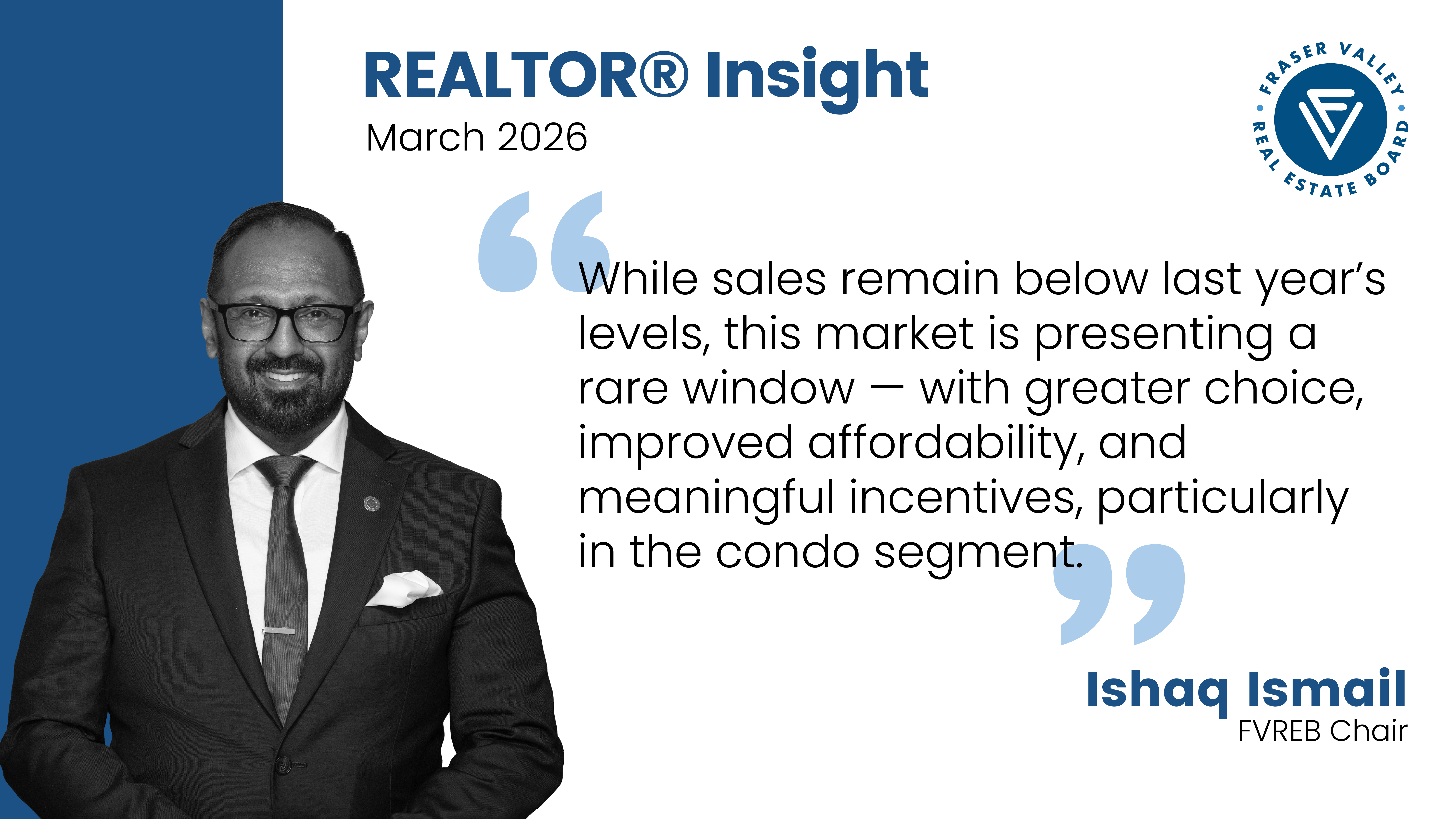 “We’re encouraged to see early signs of prices levelling off in the Fraser Valley,” said Ishaq Ismail, Chair of the Fraser Valley Real Estate Board. “While sales remain below last year’s levels, this market is presenting a rare window — with greater choice, improved affordability, and meaningful incentives, particularly in the condo segment — for buyers who are ready to make a move with the right professional guidance.”