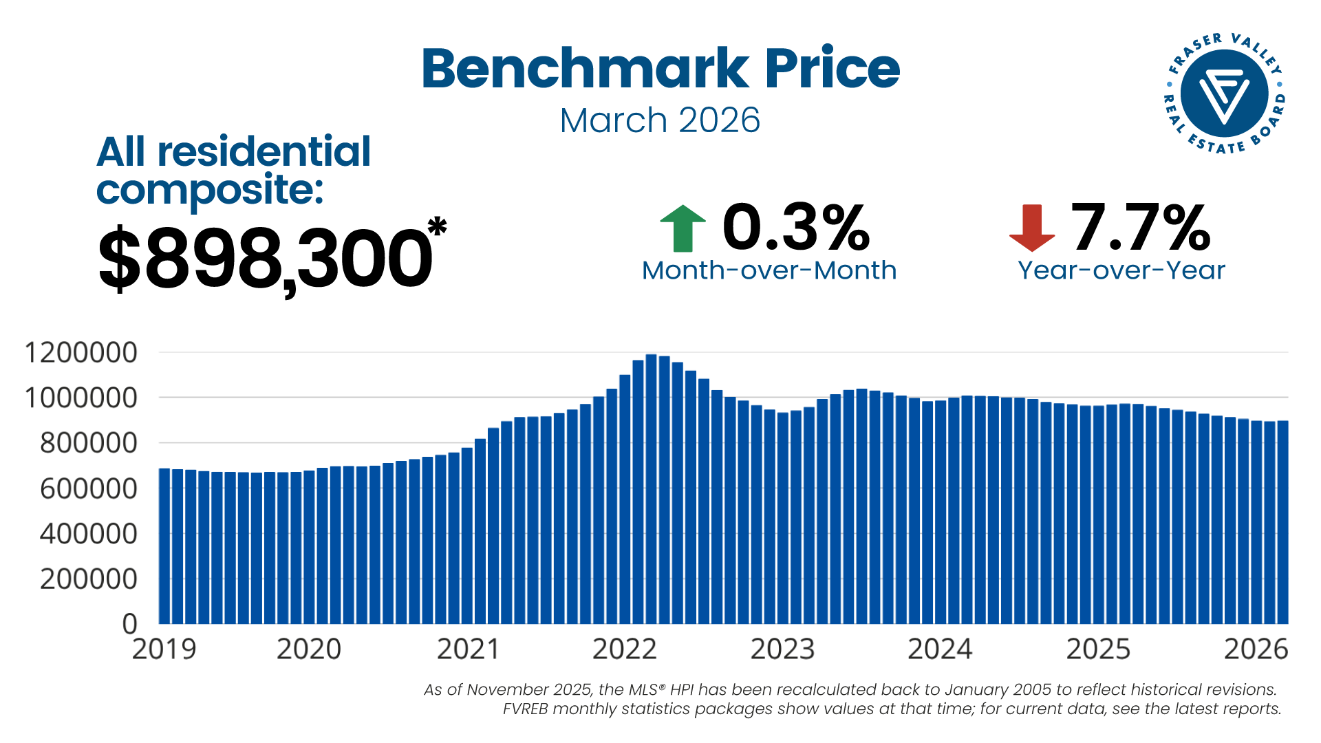 The composite Benchmark price for a typical home in the Fraser Valley increased 0.3 per cent in March, to $898,300.