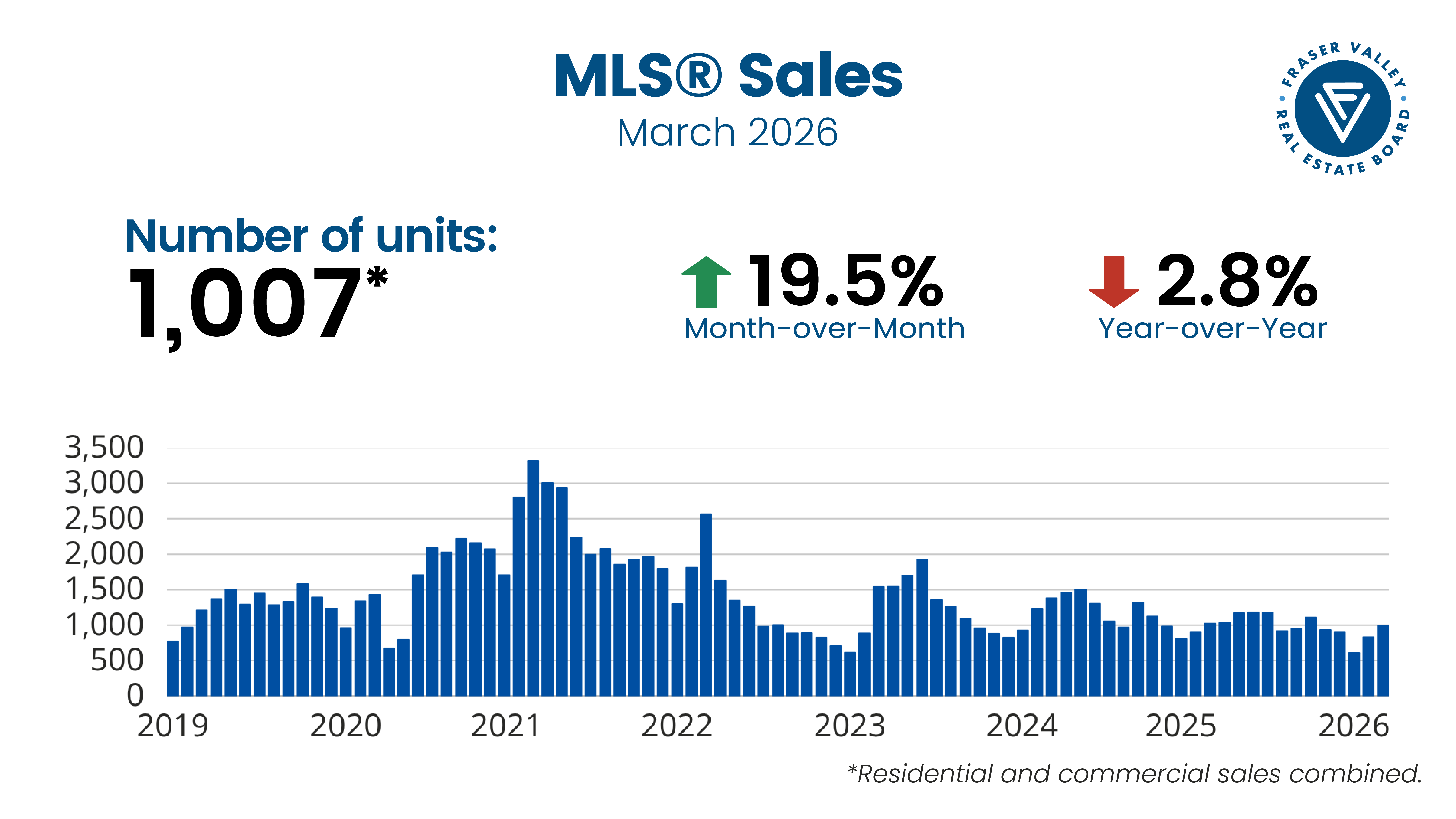 The Fraser Valley Real Estate Board recorded 1,007 sales on its Multiple Listing Service® (MLS®) in March, a 20 per cent increase from February, but three per cent below the same month last year and 42 per cent below the ten-year seasonal average. After a decline in February, new listings increased in March, up 20 per cent to 3,341, suggesting some sellers are eager to get ahead of the spring market despite sales activity remaining soft and well below typical seasonal levels.
