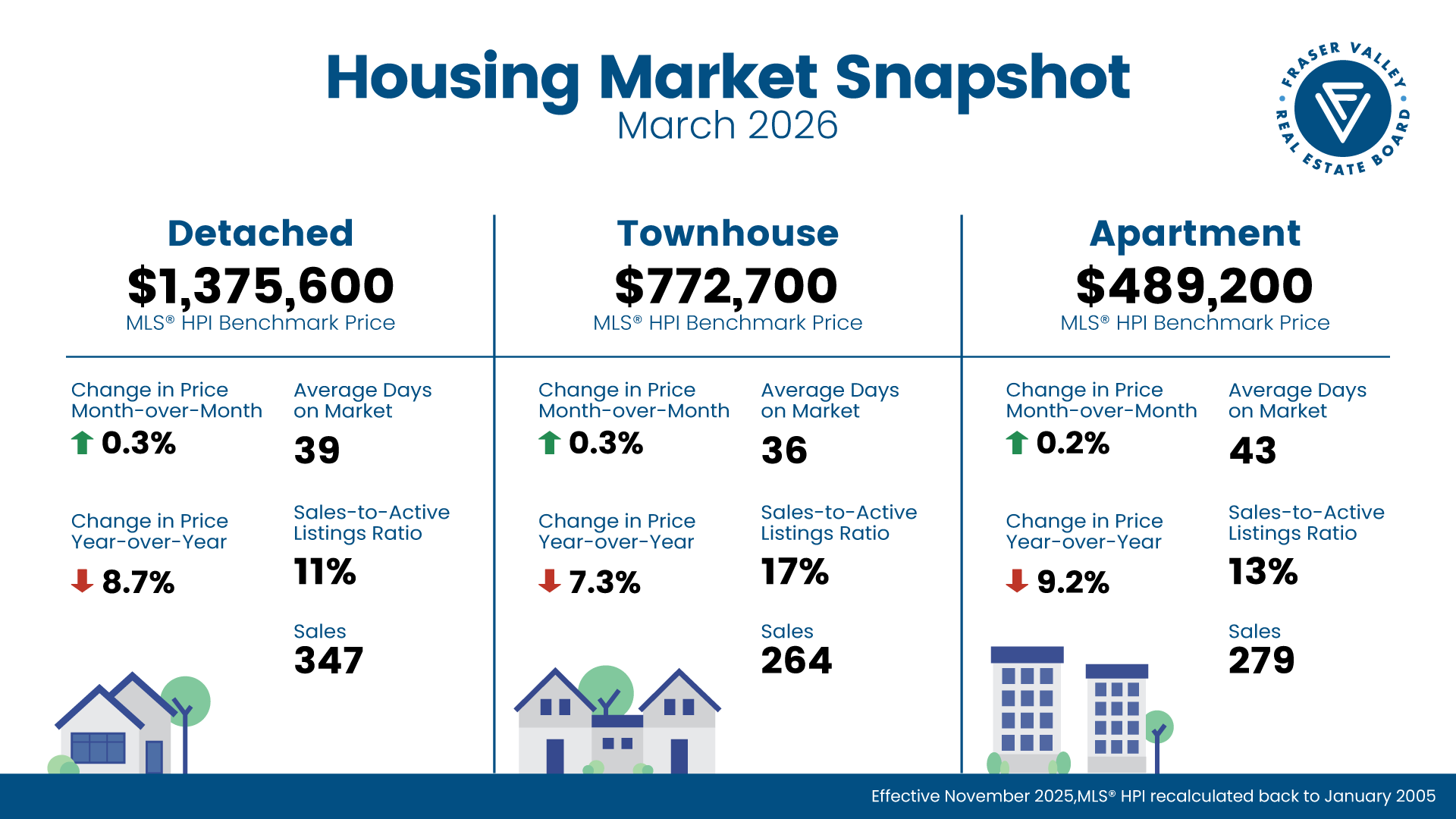 Apartments: At $489,200 the Benchmark price for an FVREB apartment/condo increased 0.2 per cent compared to February 2026 and decreased 9.2 per cent compared to March 2025.
